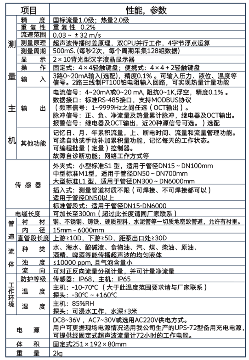 管段式超声波流量计,高清液晶显示,中英意三种语言,可显示瞬时流量、净累积量、瞬时流速、正累积量、负累积量、日期时间、热流量/总热量、温度输入三线制PT100、今日累积流量,储存或读取管道参数等功能。 采用三防涂漆进口主板元件,功耗低、精准稳定、无压损。防护等级可达!P68;流量范围可达1500:1;测量介质温度可达160℃。根据现场需求可定制GPRS无线远传/电池供电/高精度双声道一体式,广泛用于工业生产、商业计量和水利检测等方面,提高了管网的输水效率。